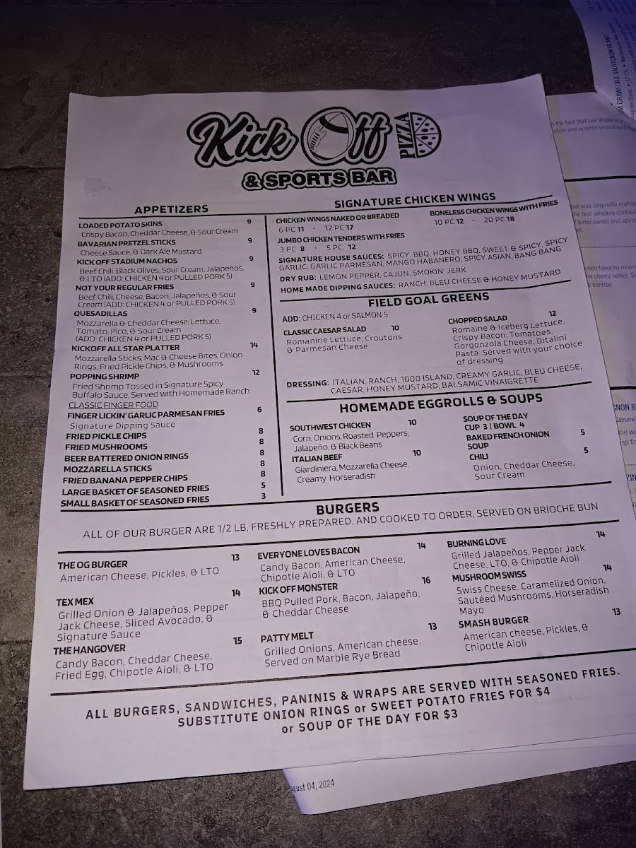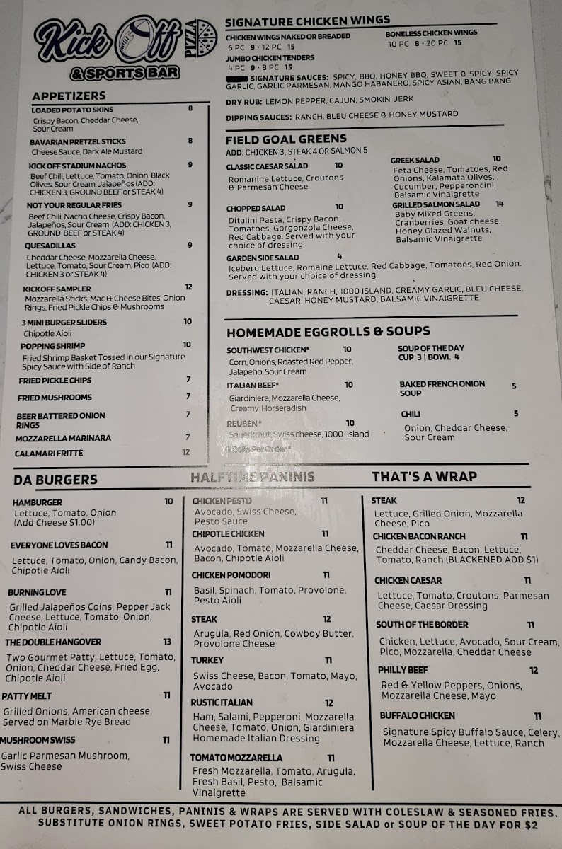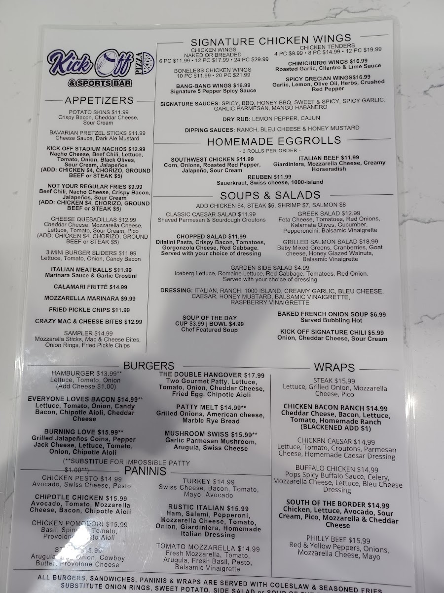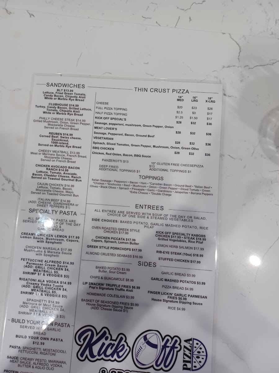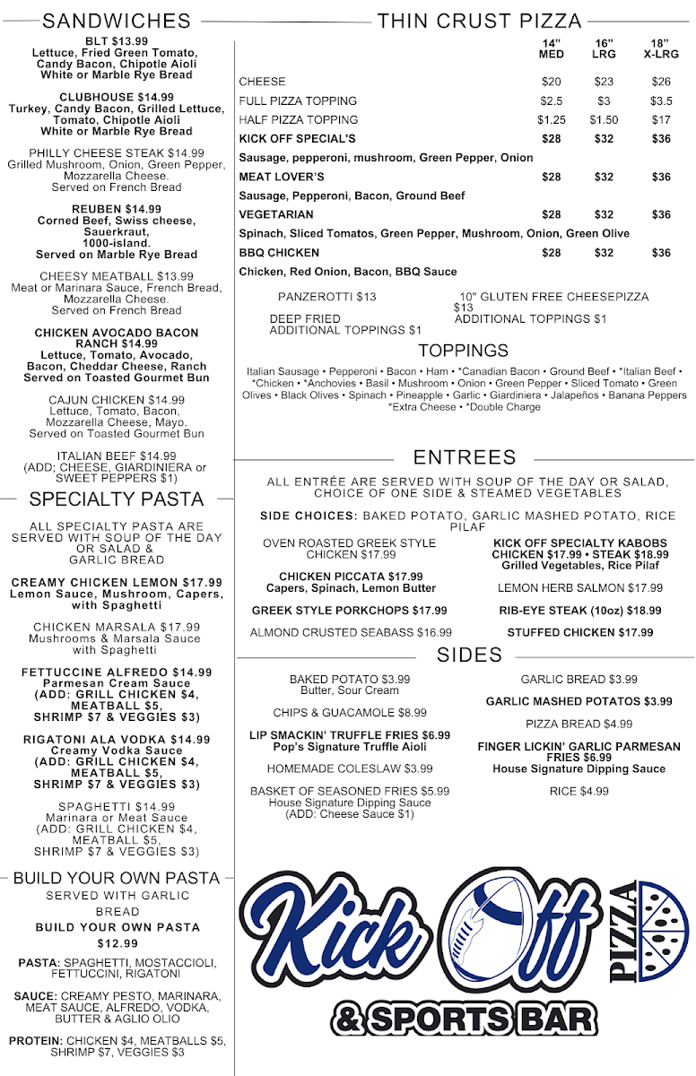 Welcome to Kick Off Pizza & Sports Bar, your go-to destination for delicious food and thrilling sports in Romeoville. Nestled at 1101 N Independence Blvd, this vibrant establishment boasts a menu designed to satisfy every palate. From their signature pizza—known for its irresistible crust and fresh toppings—to scrumptious boneless garlic parm wings, every dish is a celebration of flavor.